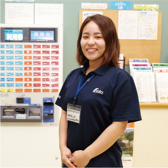 中学生の時に所属していたバレーボール部のコーチが、トレーニングの指導や体のメンテナンスをしてくれたのがきっかけでスポーツに関わる仕事がしたいと思いました。SOLAに入学後は試験対策などの勉強が大変でしたが、社会人になった今思うと有意義な時間でした。また、アクアビクスの練習などで他施設を借りて練習した時は、実際に施設を目の当たりにして感動しました。卒業後は、県外のリラクゼーションサロンでセラピストとして働きましたが、地域に密着した職場に勤めたくなり帰郷。健康運動実践指導者の資格を活かし、現在勤務している「まじゅんらんど」に就職しました。今は、地域の方々とのふれあいが多く、「ありがとう」と感謝されることに生きがいを感じています。業務は施設管理の他、運動指導や栄養指導なども行います。資格に対する周囲からの信頼が厚いので、資格を取って本当に良かったなと思いました。
